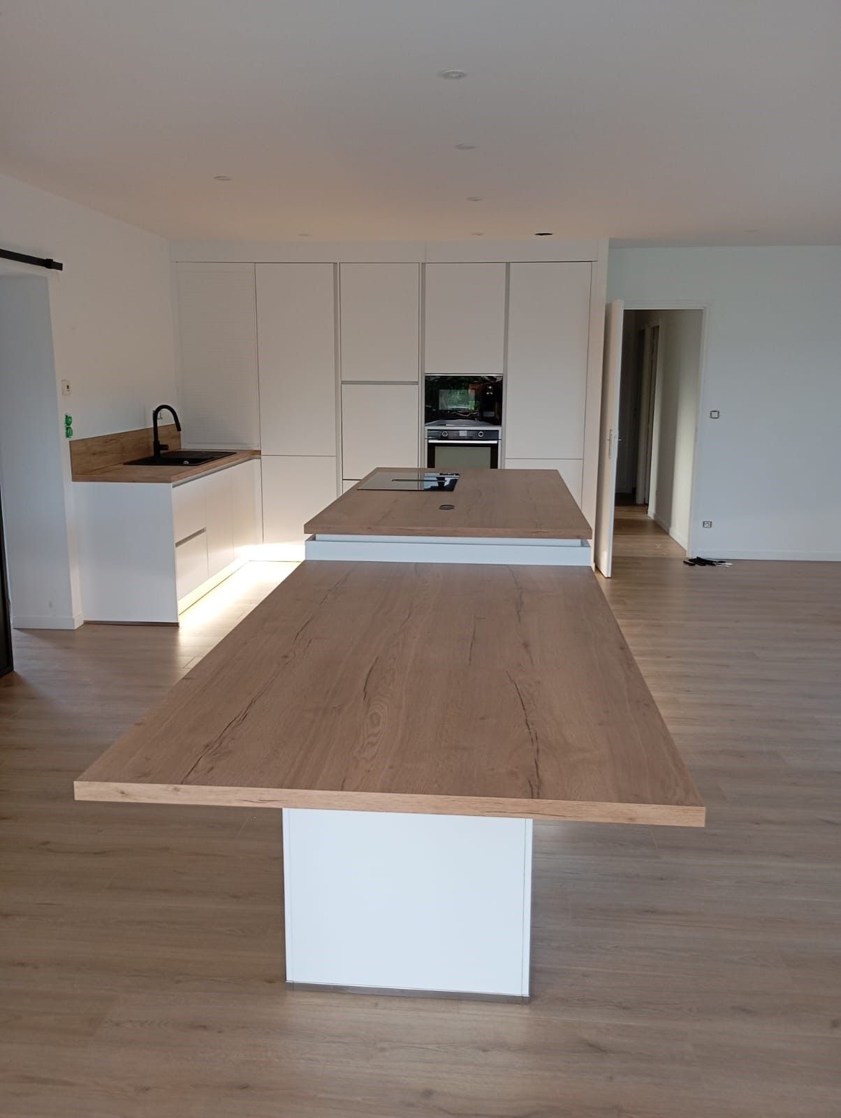 Alliez modernité et chaleur avec une cuisine au design épuré. Les façades blanches apportent luminosité et élégance, tandis que les touches de bois créent une ambiance conviviale et naturelle.