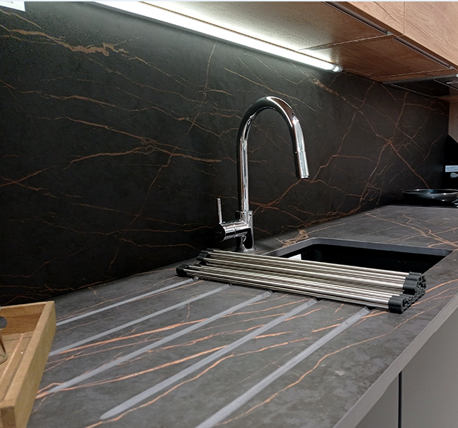 Il existe également pour les plans de travail en pierre des éviers collé sous les plans avec la possibilité de faire un rainurage d’égouttoir usiné dans la masse.