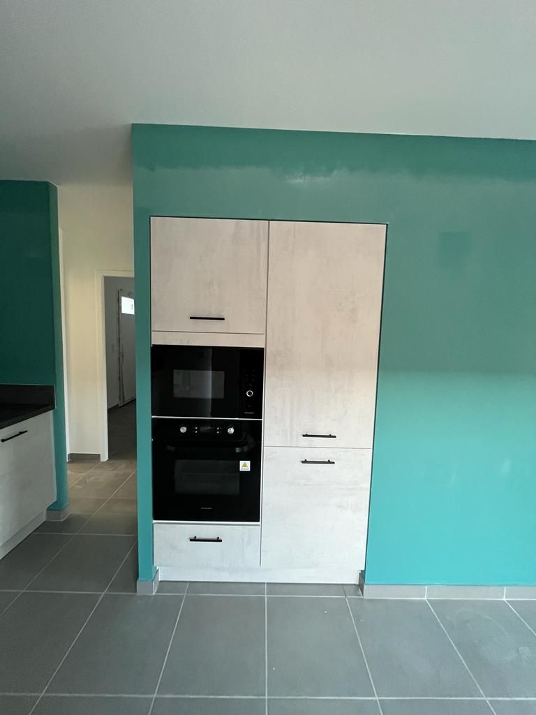 Cuisine ouverte avec électroménagers intégrés, n’ayez pas peur de mettre de la couleur pour faire resortir les meubles. Pose de la cuisine éffectuer en une journée par nos poseurs.